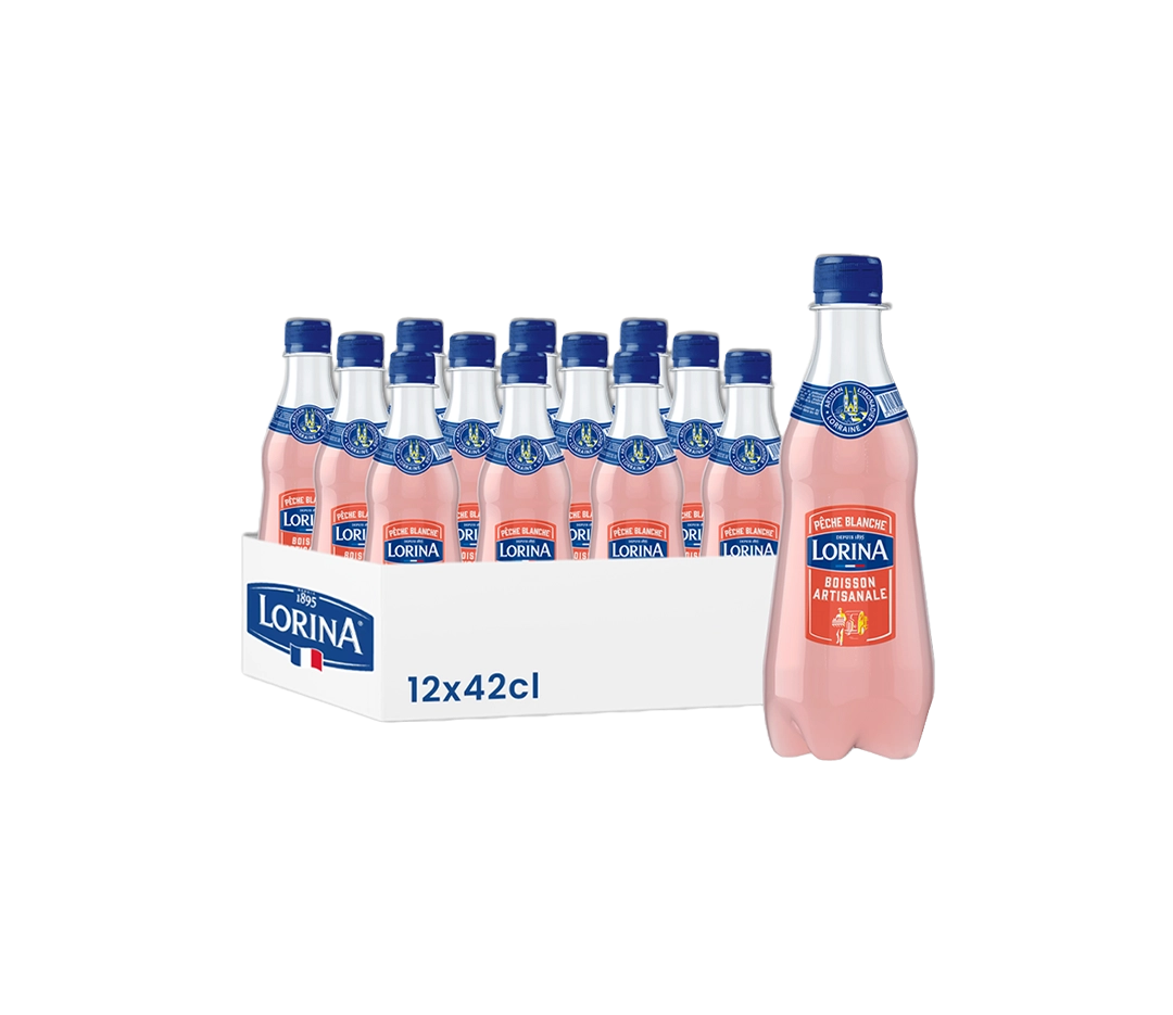 Lorina Limonade Pêche Blanche en pack de 12 bouteilles de 42cl. Une boisson pétillante au goût rafraîchissant et fruité de pêche blanche.