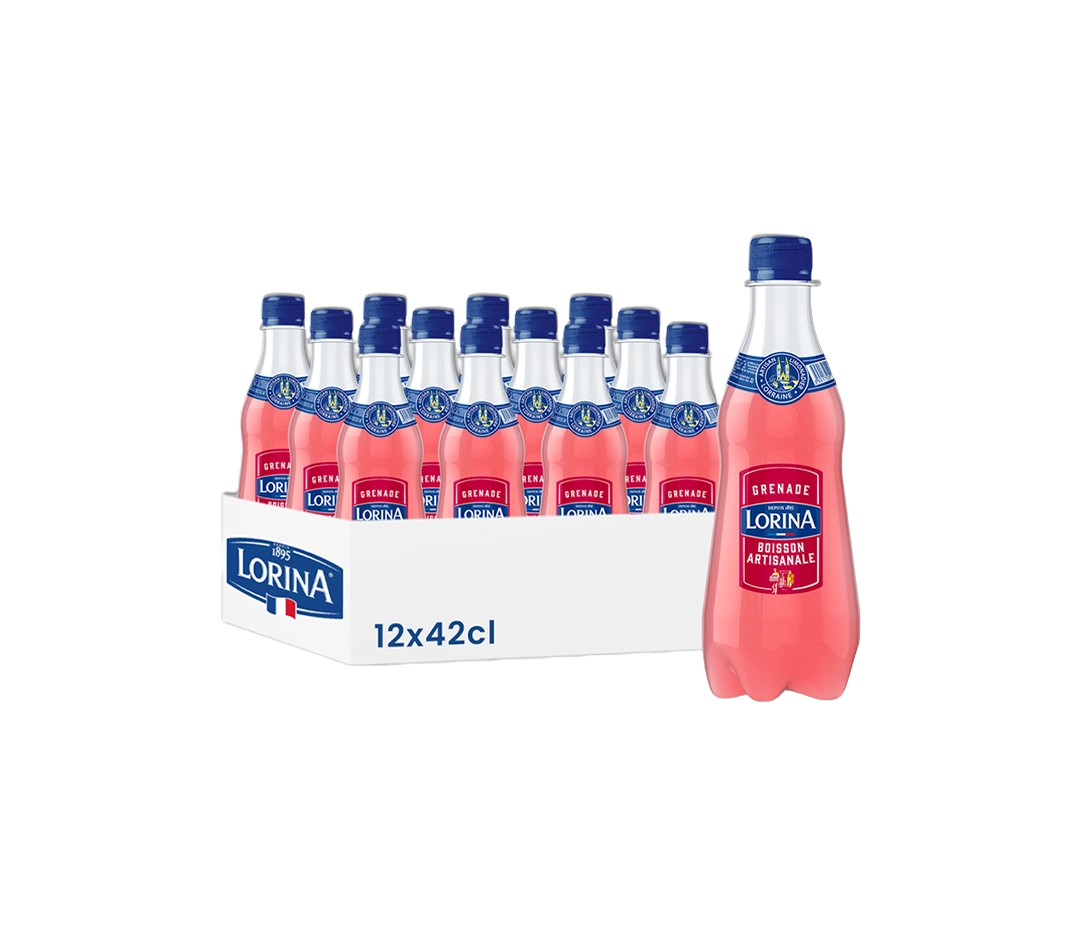Lorina Limonade Grenade en pack de 12 bouteilles de 42cl. Une boisson pétillante au goût rafraîchissant et fruité de grenade.