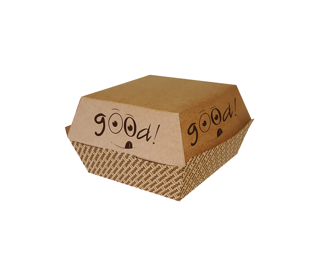 Boîte en carton kraft robuste et biodégradable, idéale pour les burgers et plats à emporter. Facile à refermer, convient aux aliments chauds et froids.
