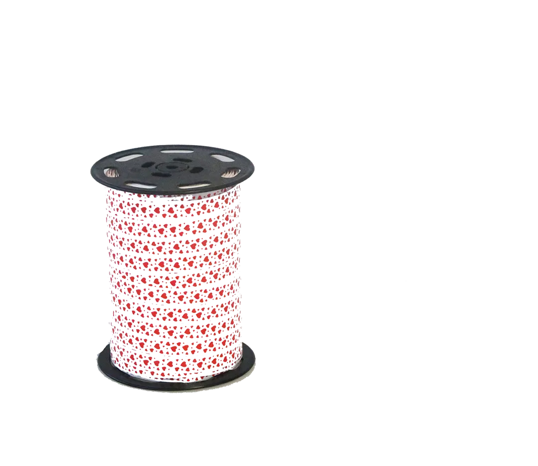 Bolduc blanc avec cœurs rouges.