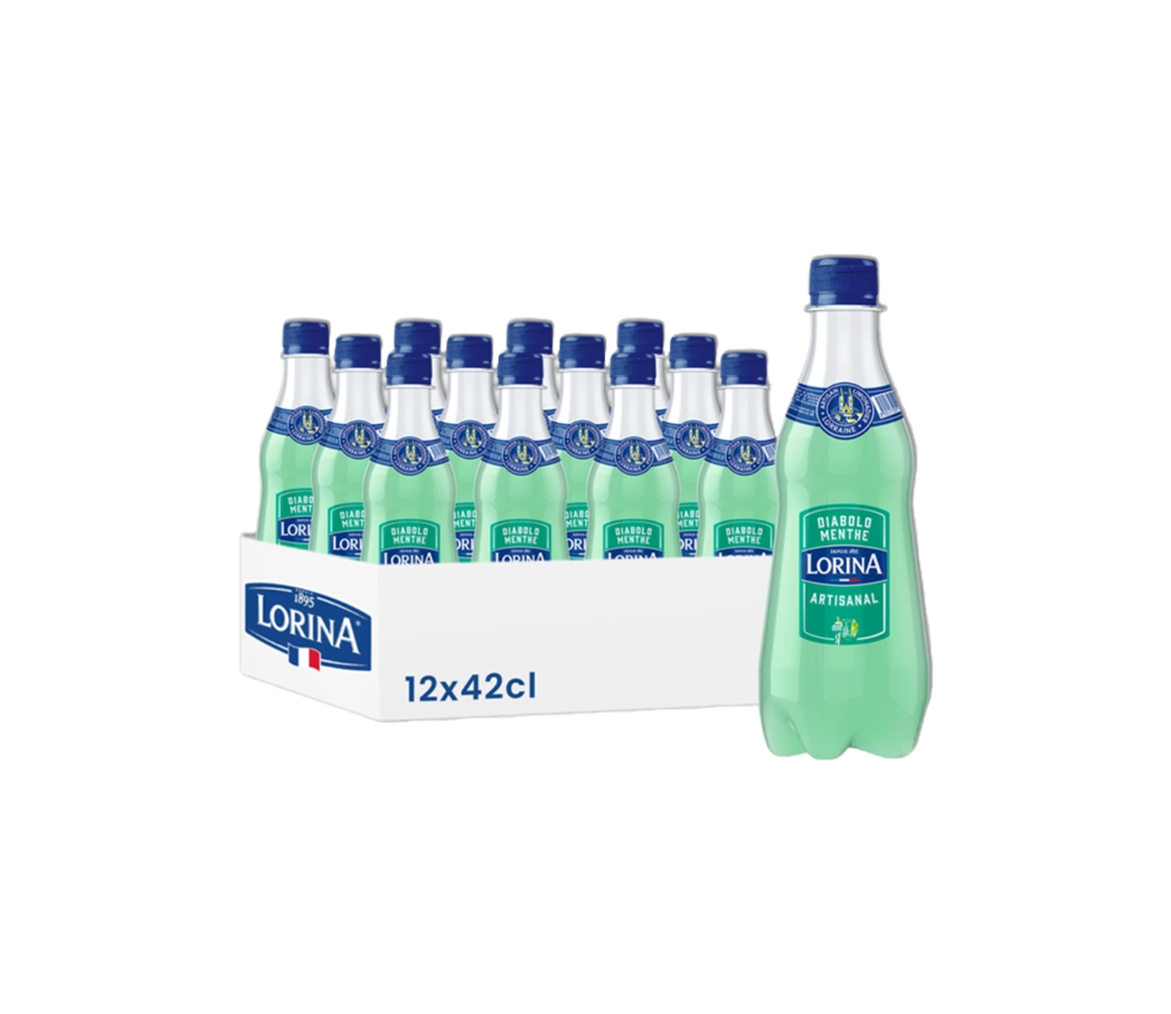 Lorina Limonade Diabolo Menthe en pack de 12 bouteilles de 42cl. Une boisson pétillante au goût rafraîchissant et fruité de menthe.