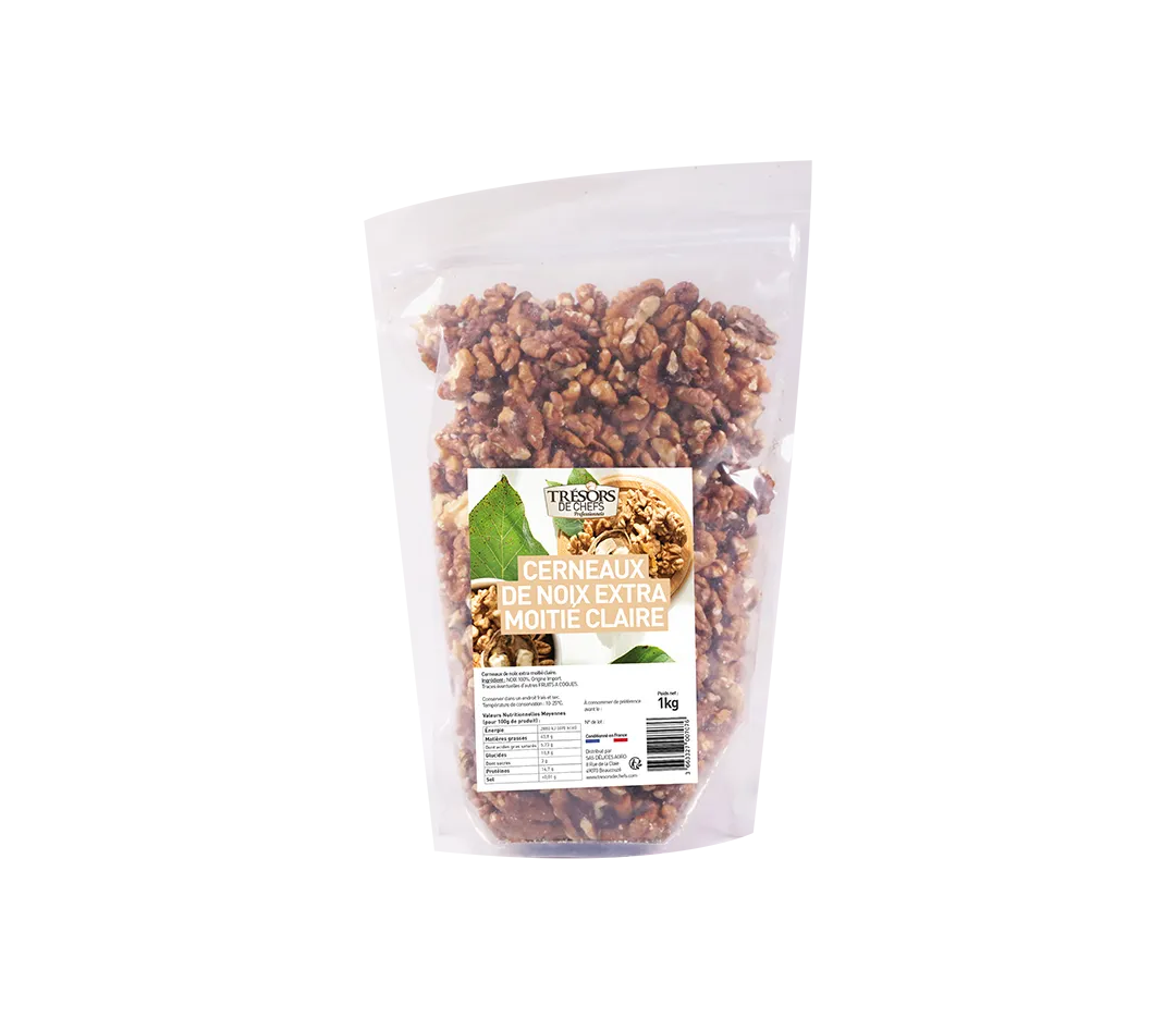 Extra: Cerneaux de noix de qualité supérieure, de couleur uniformément claire avec au plus une trace jaune, mais à l'exclusion de trace d'ambre. Ils doivent être pratiquement exempts de tout défaut, à l'exception de très légères altérations superficielles, à condition qu'elles ne portent pas atteinte à l'aspect général du produit, à sa qualité, à sa conservation ou à sa présentation dans l'emballage.