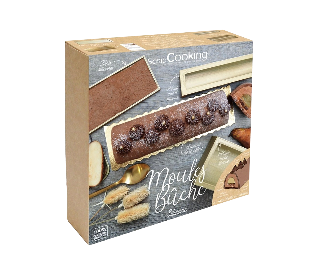Le coffret comprend un moule pour bûche, un moule à insert, tous deux en silicone, un tapis pour génoise également en silicone, un livret de recettes pour inspirer vos créations, et un support doré pour présenter vos bûches avec élégance.