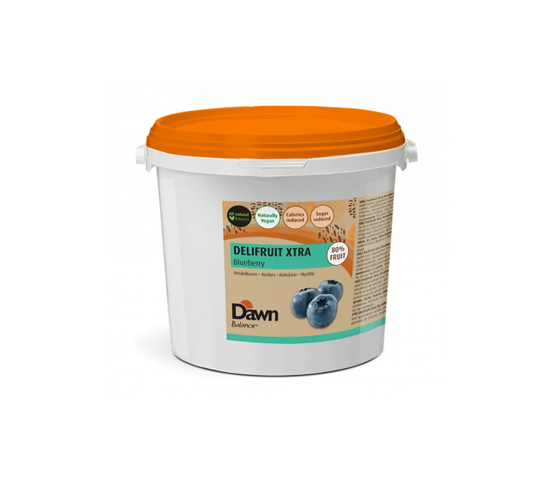Découvrez le Fourrage Delifruit Xtra à la Myrtille de Dawn : une préparation prête-à-l'emploi avec une teneur élevée en fruits d'environ 90%. Parfait pour les fourrages de viennoiseries et les garnitures de tartes, sa consistance reste intacte à la cuisson. Ce fourrage de fruit de haute qualité offre le vrai goût de la myrtille avec une juste dose de sucre, celui-ci a été réduit et remplacé par plus de fruits et d'édulcorants naturel.
