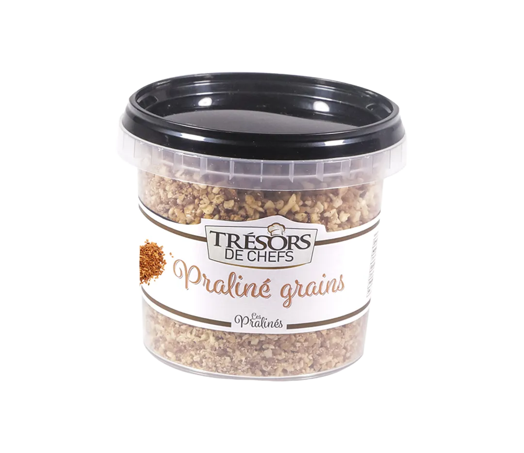 Le praliné grains noisettes une préparation à base de noisettes hachées, caramélisées (sans apport de conservateurs) qui s'utilise en pâtisserie (gâteaux, entremets, décoration), en glacerie et en fourrage (bonbons).