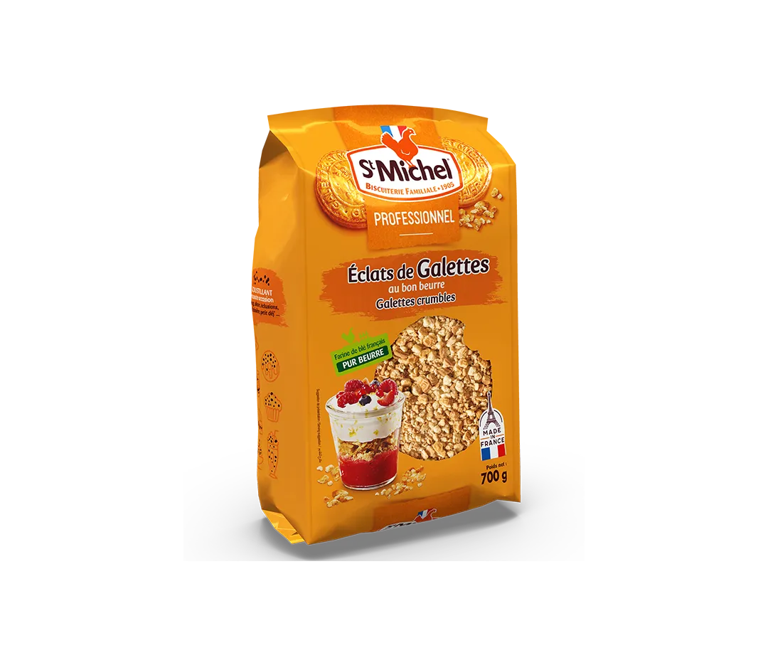 La célèbre galette St Michel au beurre déclinée en éclats pour un nouvel usage. En topping sur une glace, un fromage blanc, un yaourt, une compote. Ou en inclusion dans des verrines, des crêpes. Encore, à utiliser en base pâtissière : cheesecake, fond de tarte ou shortbread. A vous de créer !