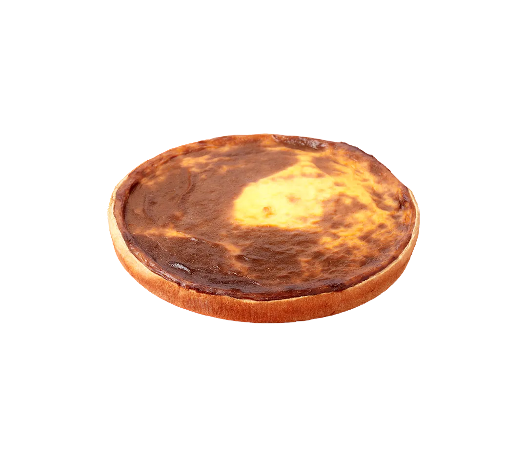 Flan nature à cuire composé d'une pâte brisée au beurre, garnie d'un appareil flan (lait, oeuf) crémeux et fondant.