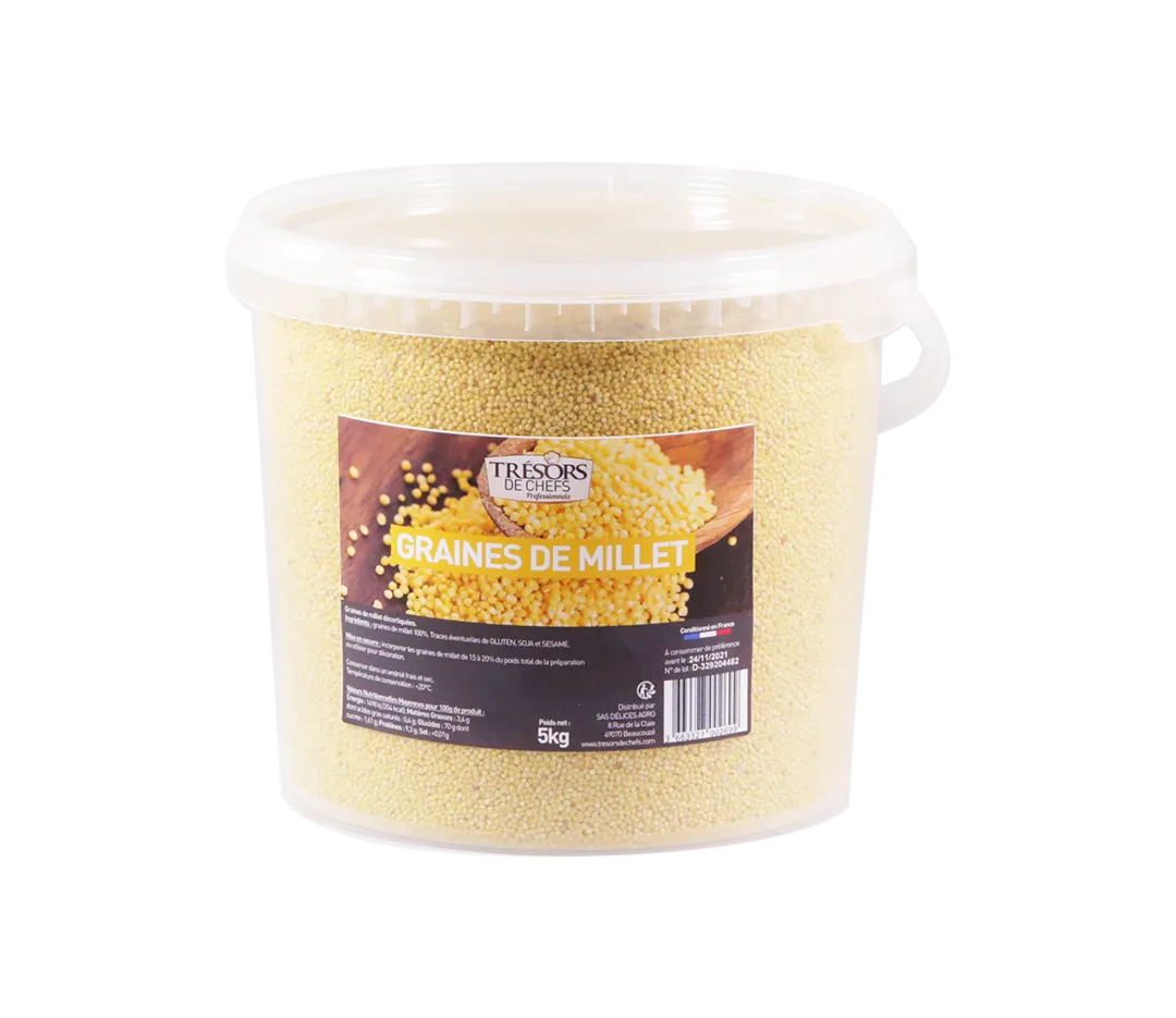 Les graines de millet ont une belle couleur dorée avec une saveur douce et un goût légèrement sucré. Torréfié la graine de millet gagne en saveur noisette. Elle est remarquable dans les préparations boulangères par sa texture croquante qui éclate sous la dent.