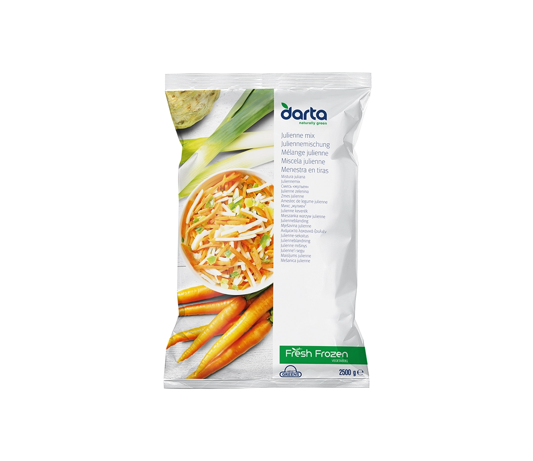 Mélange de 40% de céleri-rave en julienne, 20% de poireaux en cubes et 40% de lanières de carottes.