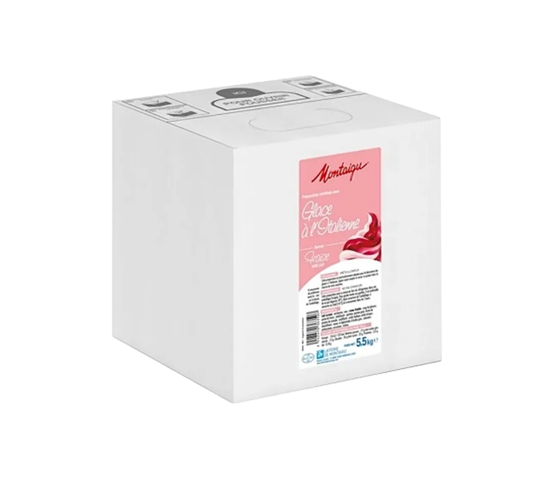 Préparation liquide stérilisée UHT pour glace «soft» à l’italienne à base de lait, de pulpe de fraise aromatisée, de colorants naturels et d’un complexe de stabilisants.