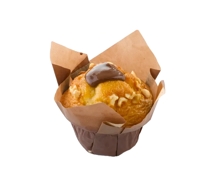 Un muffin vanille au grammage généreux fourré de chocolat noisettes et décoré de noisettes.