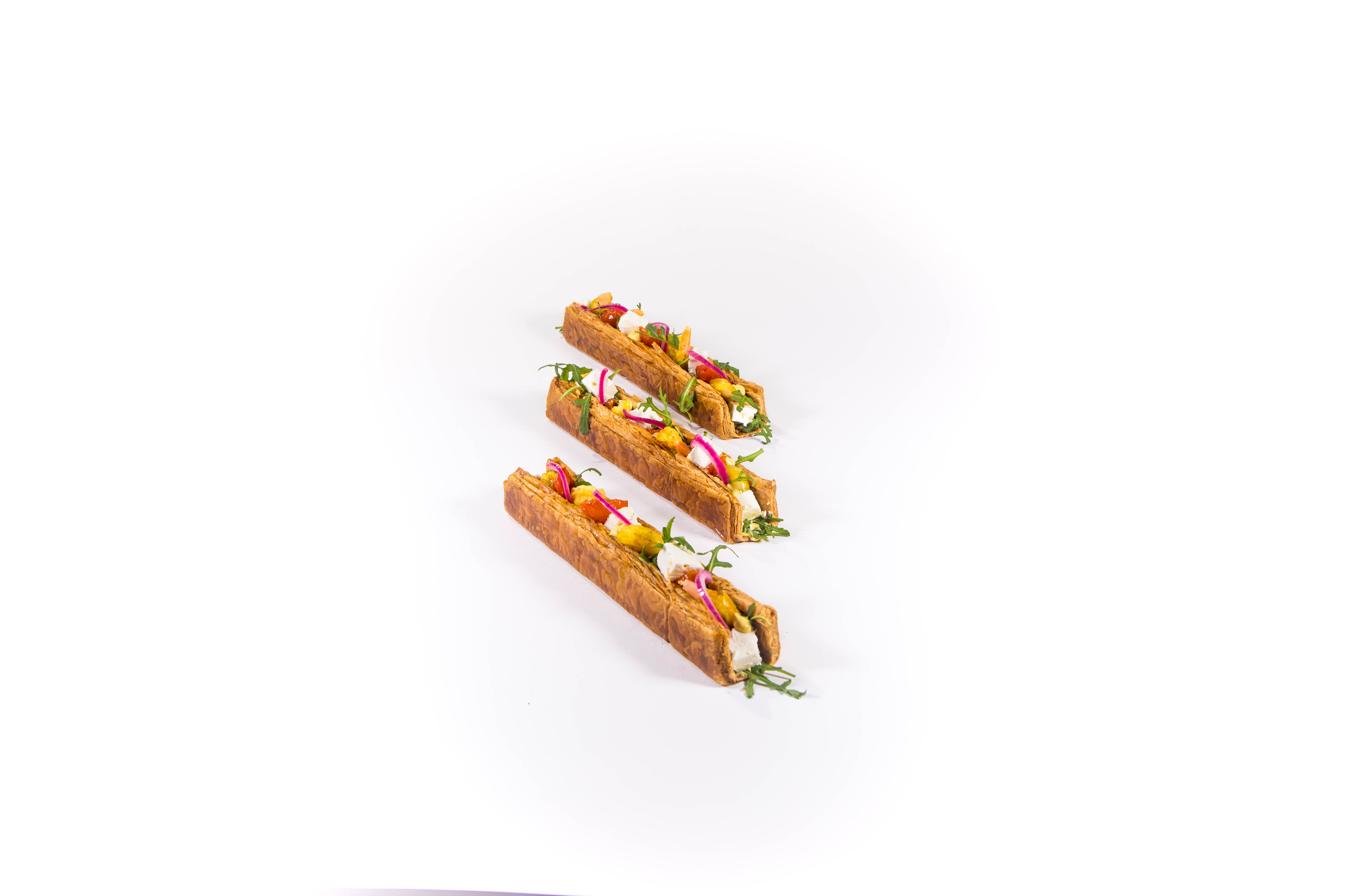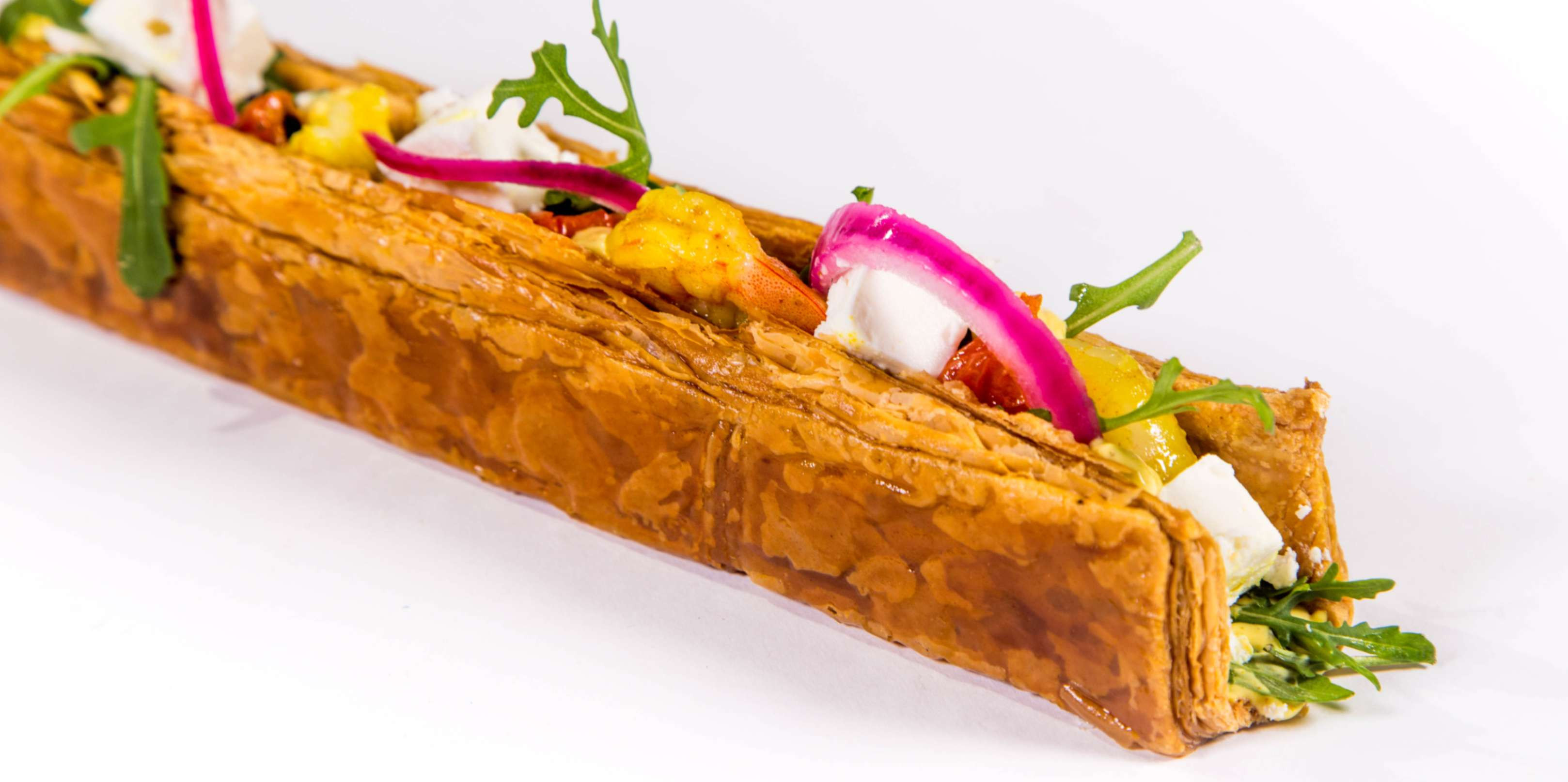 Une barre feuilletée croustillante garnie de crevettes au curry, feta et pickles d’oignons rouges, pour une recette savoureuse et originale.