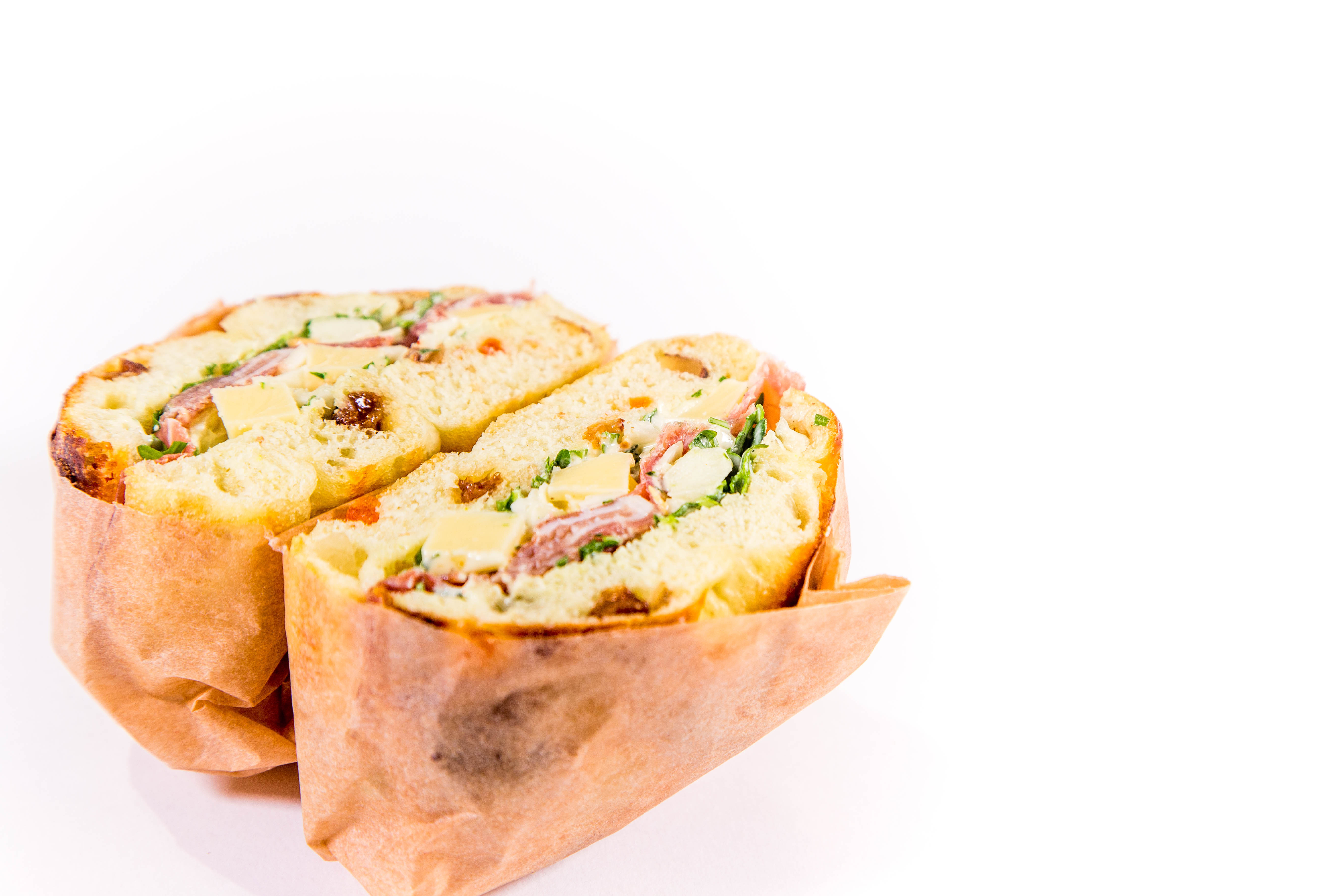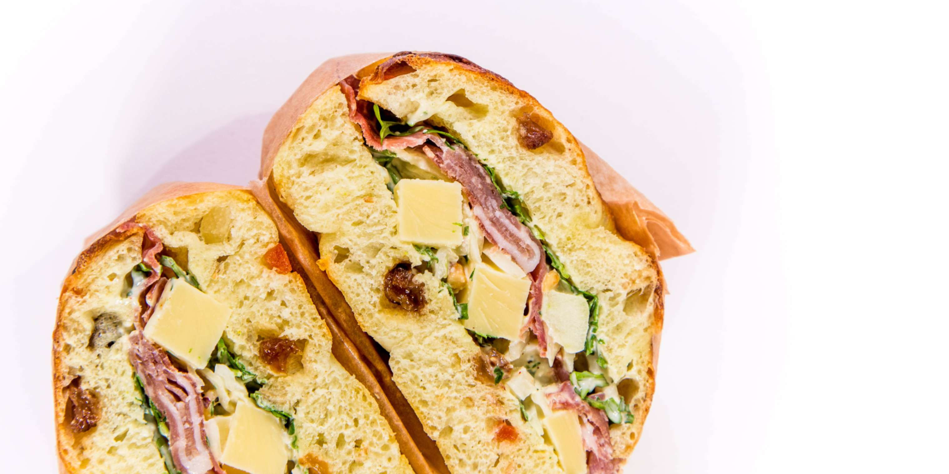 Un club focaccia généreux mêlant jambon de pays, roquette, sauce échalote-persil et le croquant d'une originale rémoulade chou-pomme-comté-noisette !