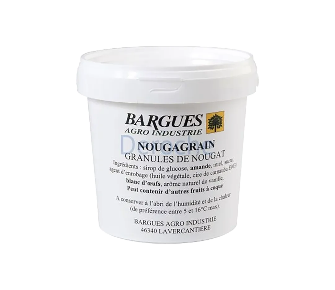 97 % de nougat de Montélimar : 36,5 % de sirop de glucose base blé origine France, 30,4 % d'amande émondée, 17,65% de miel de fleurs toutes origines, 14,85 % de sucre cristallisé origine betterave sucrière France, 0,33 % de blanc d'œuf origine France, 0,27 % d'arôme naturel de vanille conforme au règlement 1334-2008 CE.