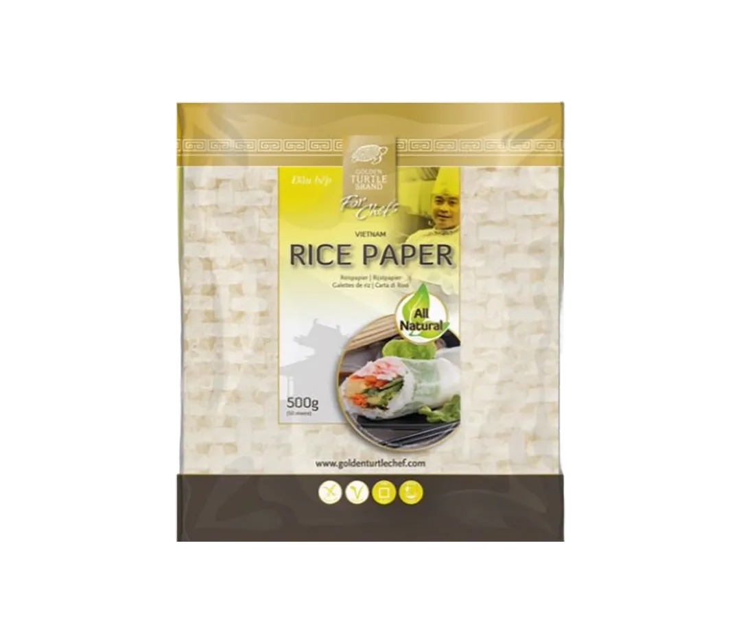 La galette de riz Golden Turtle for Chefs™ est faite à partir de riz cultivé dans la région fertile du delta du Sud du Vietnam. Une fois humidifiées, les galettes de riz peuvent être garnies de salade fraîche, ou utilisées pour réaliser des rouleaux impériaux vietnamiens. La galette de riz carrée est encore plus pratique pour la confection des rouleaux ou wraps.