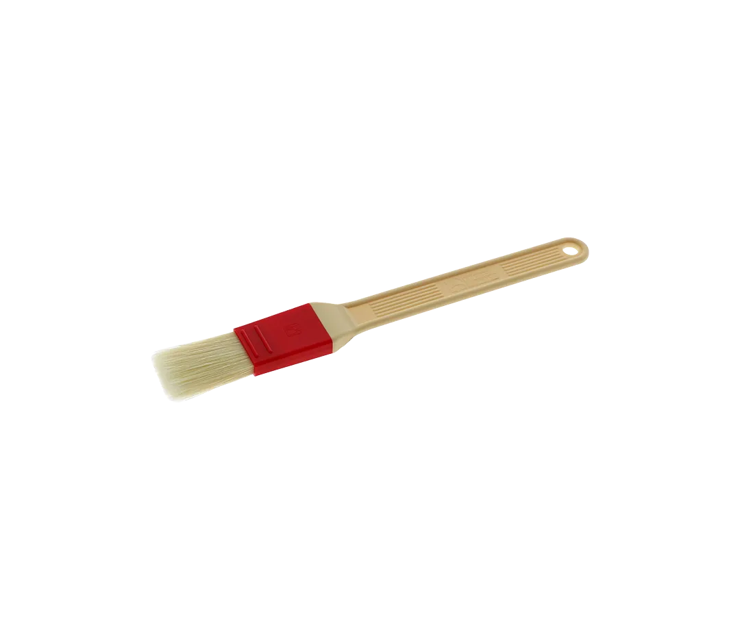 En soie avec un manche en plastique. Idéal en cuisine et en pâtisserie pour étaler, badigeonner sirop, jaune d'œuf, sauces sur vos préparations.