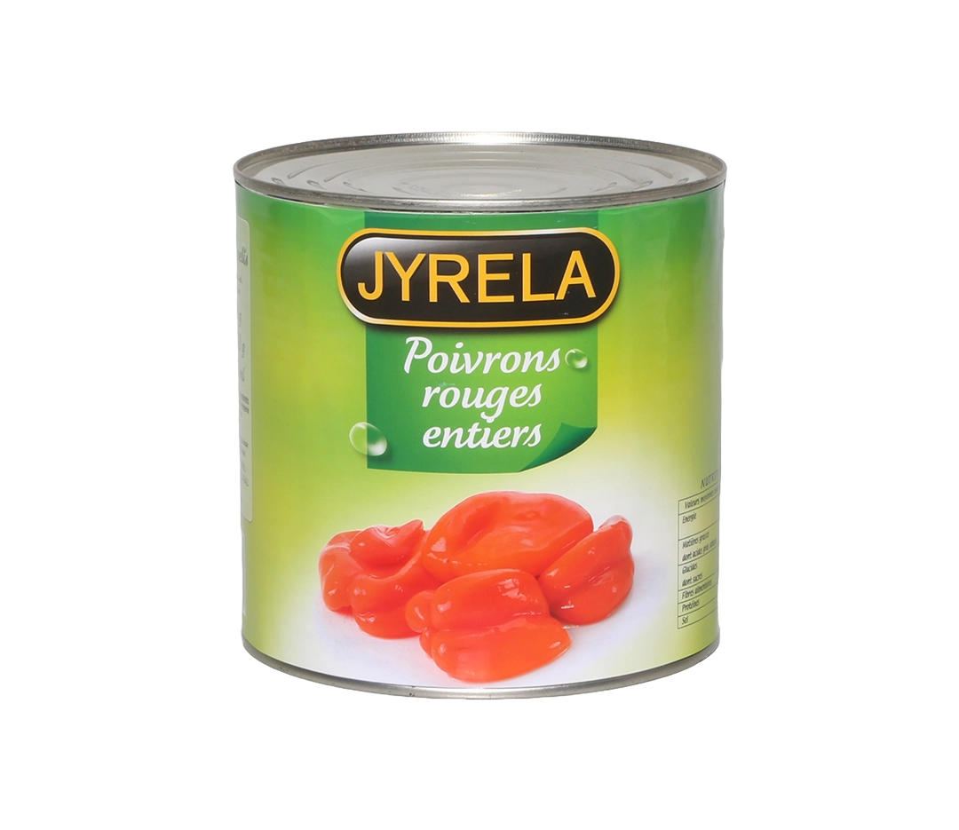 Conserves alimentaires de poivrons rouges entiers et pelés, élaborées à partir de poivrons sélectionnés, dépourvus de peau.