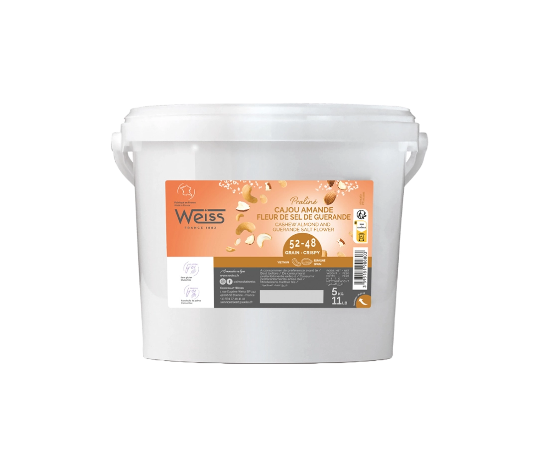 Son goût de noix de cajou torréfiée et caramélisée agrémenté d’une délicate pointe de fleur de sel de Guérande apporte une touche d’exotisme à vos créations.