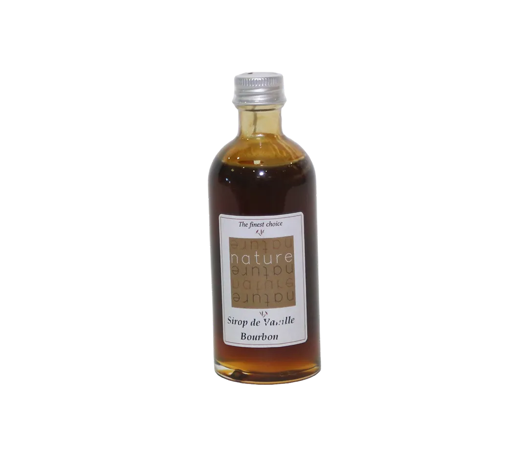 Sirop de vanille Bourbon de Madagascar, entièrement naturel, très concentré, de couleur ambrée, apprécié par les cuisiniers professionnels. Quelques gouttes suffisent pour donner une note vanillée et caramélisée à tous les desserts et même sur certaines viandes blanches.