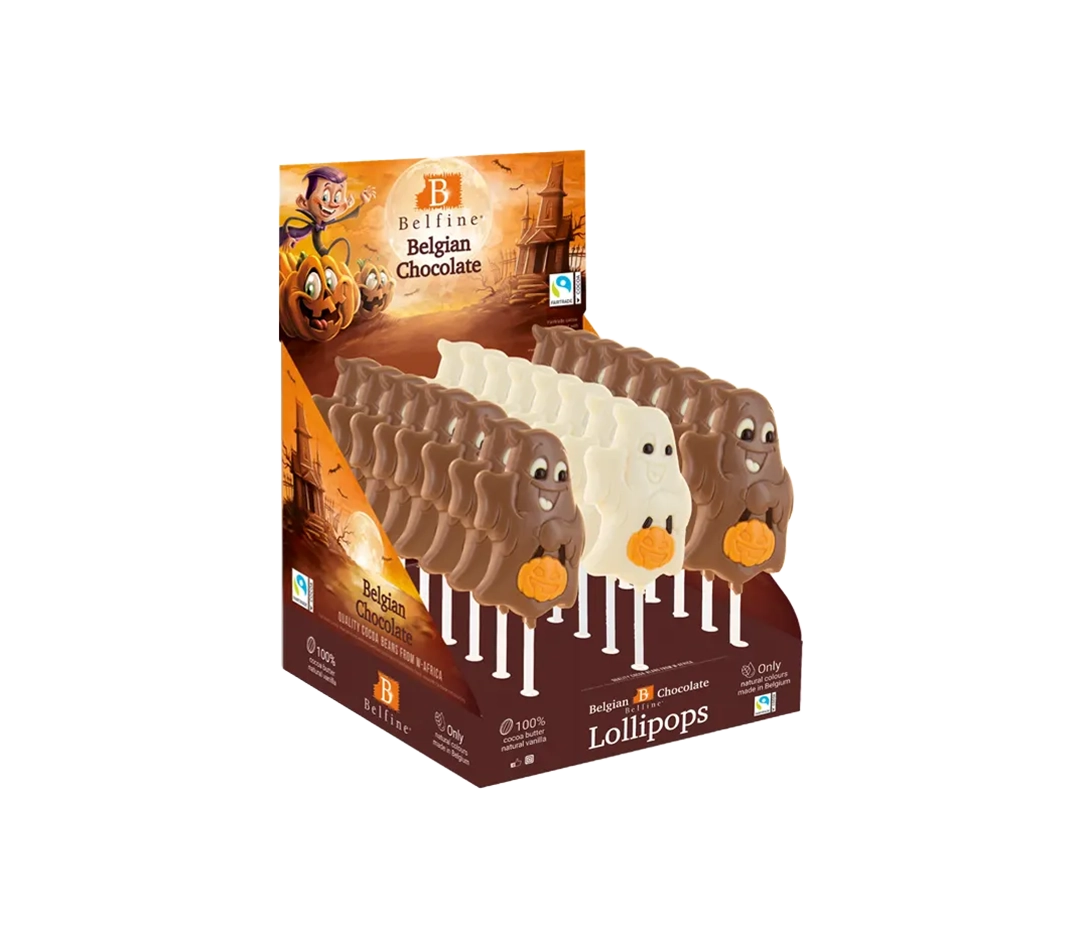 Sucette Fantôme Boo, assortiment chocolat au lait et blanc décoré et confiserie colorée.