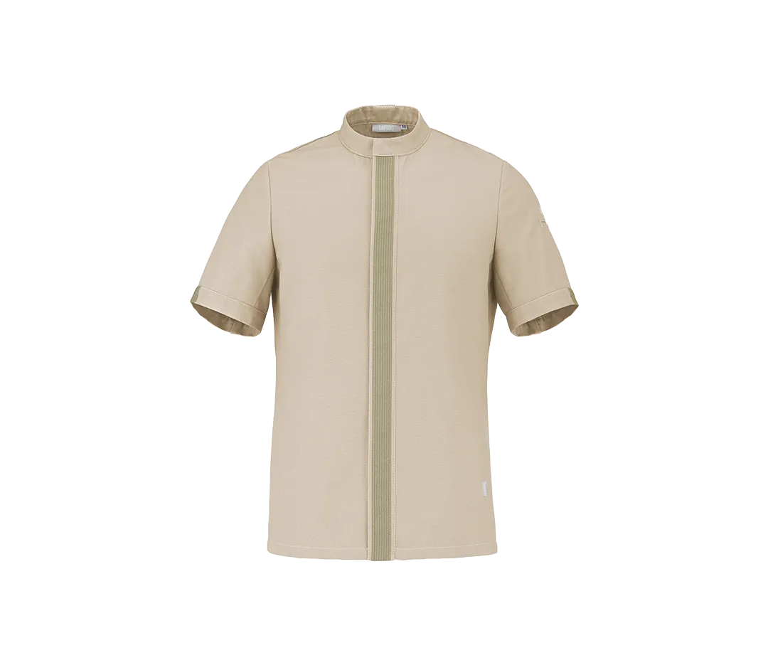 Veste de cuisine homme manches courtes, avec galon sur patte cachée millieu devant, qui apporte un détail couture très délicat. Cette veste offre une bride encolure dos pour recevoir votre tablier et le maintenir en place tout au long de votre journée de travail. La matière est en mélange de polyester recyclé.